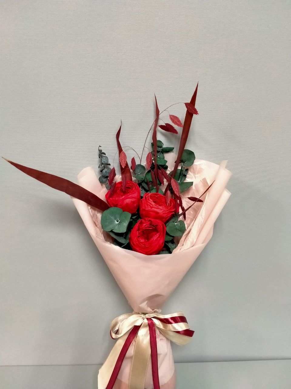 В букете использованы стабилизированные розы, стабилизированный эвкалипт и веточки .